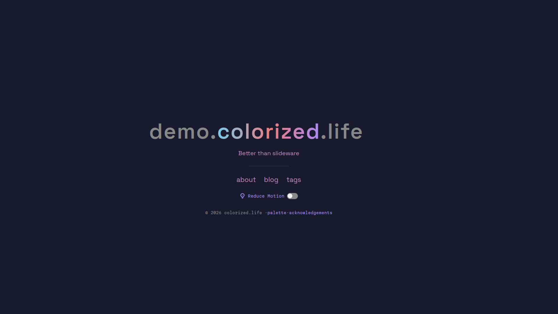 {{ hr() }}The theme respects prefers-reduced-motion: reduce at the OS level. A toggle button is also provided on both the landing page and in the site footer, storing the preference in a cookie. When cookie_domain is set in [extra] (e.g., cookie_domain = ".colorized.life"), the preference is shared across all subdomains.