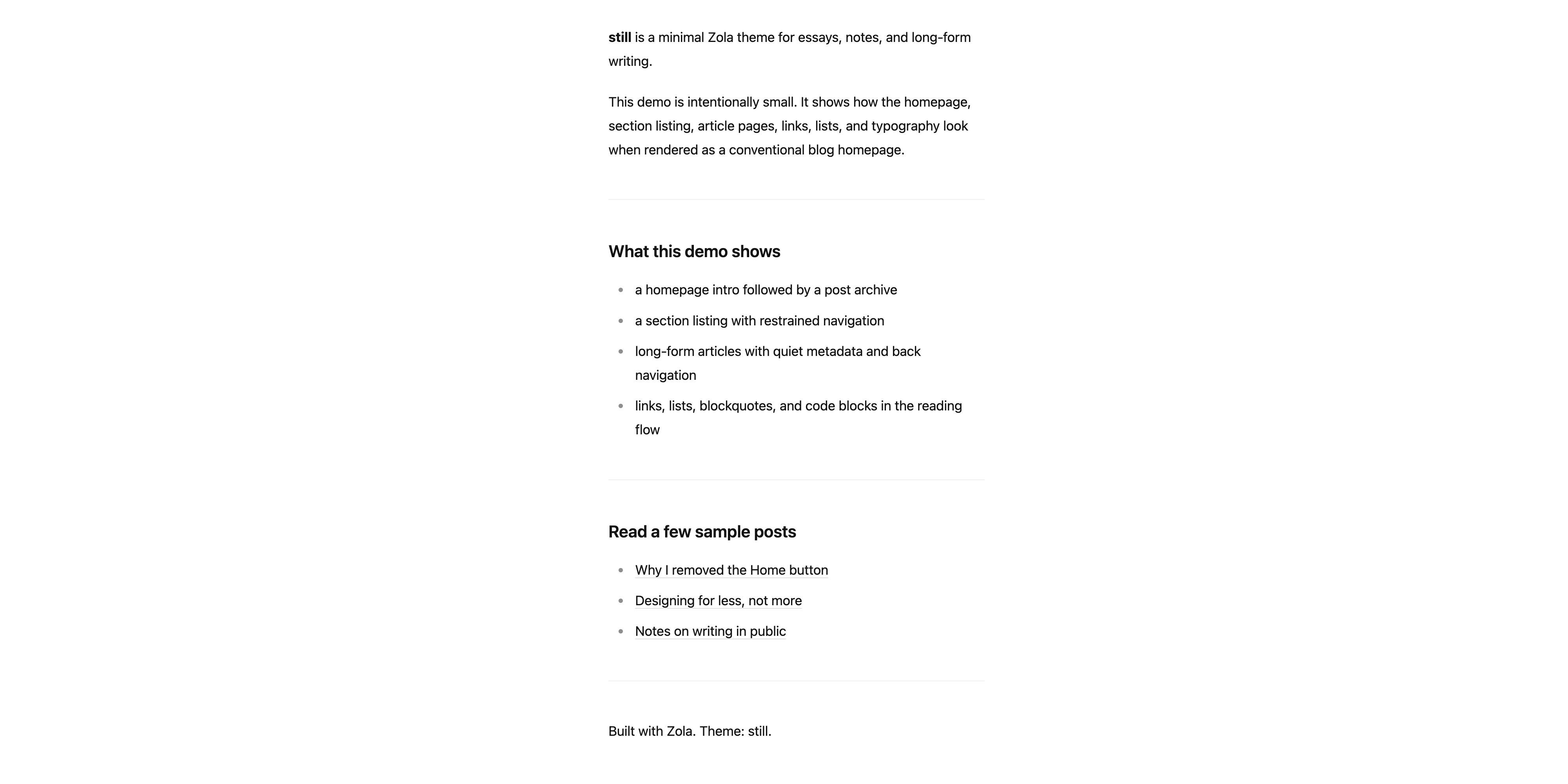 still is a minimal Zola theme for personal blogs, essays, notes, and other reading-first sites.